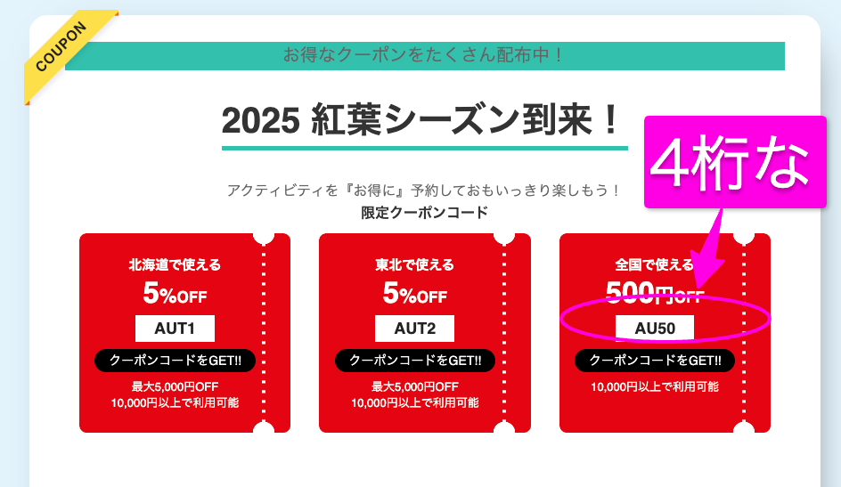 - 「◯◯円以上で利用可」「国内アクティビティのみ」などの条件付きクーポンが多いです。