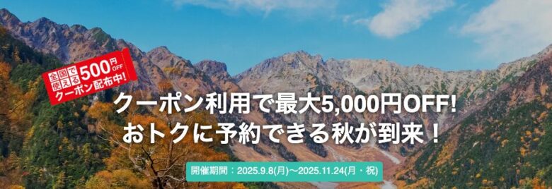 | 2025期間限定 全国で使えるクーポン | 全国で使える5%割引 | 2025年9月8日(月) 〜 2025年11月24日(月・祝) |