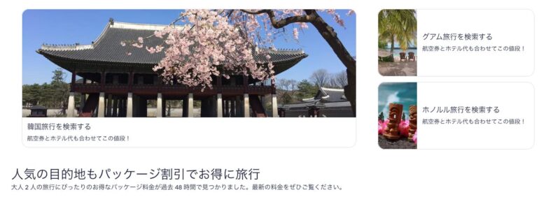 →直前割引 | 宿泊日、搭乗日の2週間以内の予約で20%以上OFF | 直前割引ページからの申し込みで割引を受けられる |