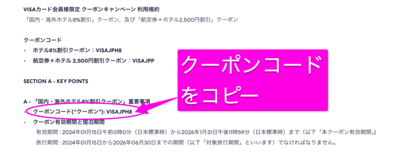 →VISA会員限定クーポンコード | 国内外のホテル8%OFF ツアー2,500円OFF | 最低適用金額50,000円 |