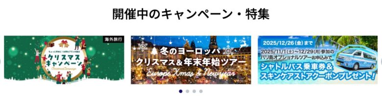 | 割引・セール内容の特徴 | ・数量限定の“売り切れ御免”プラン ・海外・国内ともに幅広い目的地を対象 ・パッケージ旅行の大幅割引が出やすい ・一部プランは特典付き(ホテルアップグレード、オプション割引など) |