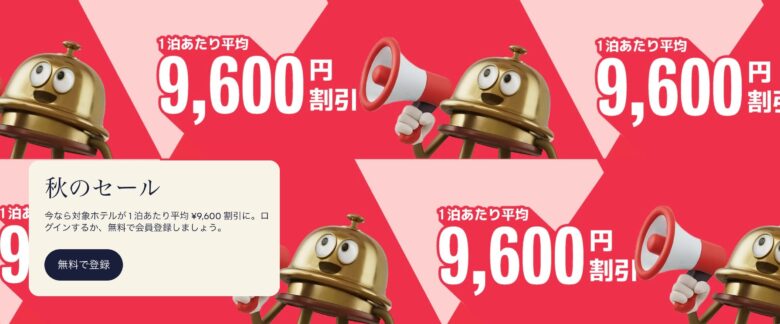 | 秋のセール→ (期間限定セール) | 一泊あたり平均9600円割引 | 予約期間: 2025 年 10 月 20 日午後 11 時 59 分 (ホテルの現地時間) まで。 宿泊期間: 2025 年 9 月 16 日 ~ 2026 年 3 月 31 日です。 季節ごとに「秋のセール」などの名称で、期間限定のセールが開催されます。会員価格と組み合わせることで、さらにお得になる場合があります。 |