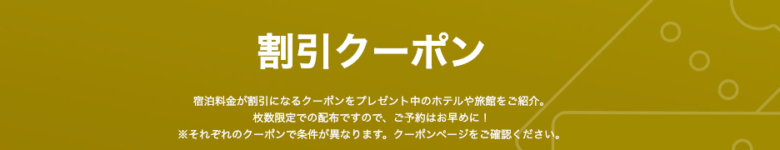 | おすすめ 宿泊施設限定クーポン | クーポン配布施設一覧→ | 最も見つけやすいが、特定の施設・レストランでしか使えない。 |
