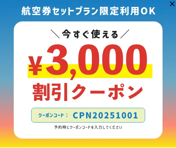 • 利用方法: 予約手続き画面で上記のクーポンコードを入力します。