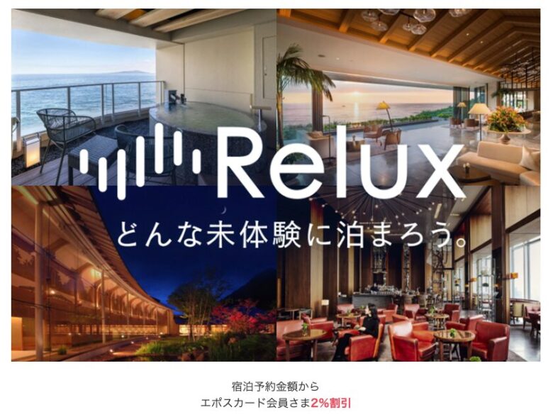 エポスカードをお持ちの方は、Reluxの宿泊予約がいつでも2%OFFになる優待クーポンを利用できます。他のクーポンが使えない時期でも安定してお得になるのが魅力です。