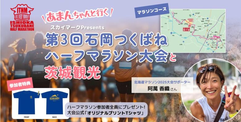 このツアーは、ハーフマラソン参加と茨城観光を同時に楽しめるお得なパッケージツアーです。札幌から茨城へ、スカイマークの直行便で気軽に参加できます。