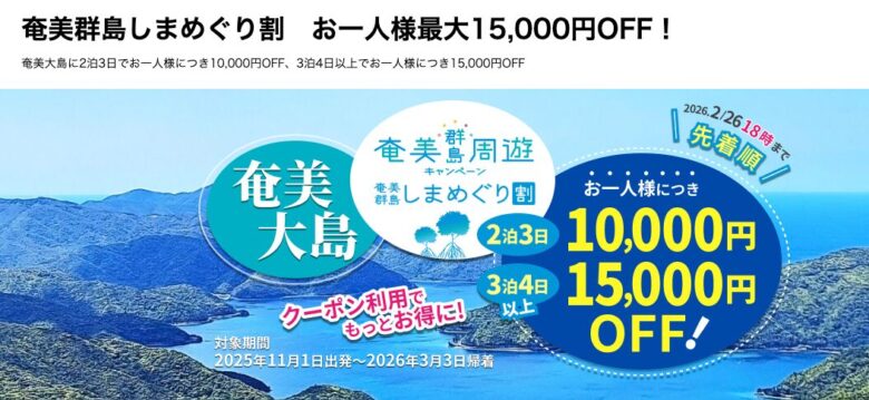 奄美群島しまめぐり割 お一人様最大15,000円OFF!クーポン