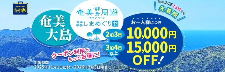 奄美群島しまめぐり割 お一人様最大15,000円OFF!クーポン