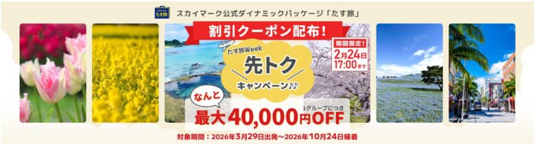 | たす旅 先トクキャンペーン | 最大40,000円OFFクーポン | 2025年9月26日予約終了 |