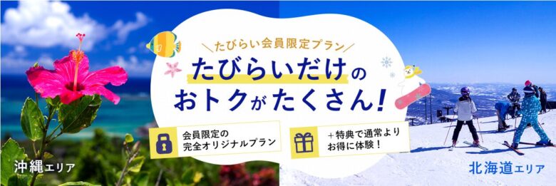| →会員限定プラン・特典 | 会員限定価格など (不定期で500円OFFクーポン等) | たびらい会員登録(無料) ※マイページログイン必須 |