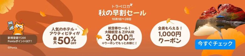 2025年10月28日までの期間限定で、秋の旅行がお得に予約できる「秋の早割セール」を開催中です。毎日先着順で割引が適用されるため、早めの予約がおすすめです。