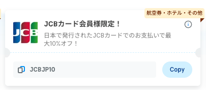 JCBカード限定クーポンは、支払い画面でJCBカードを選択するだけで自動適用されるので、クーポンコードの入力は不要です。他のクーポンとの併用可否は、予約時に確認してくださいね。