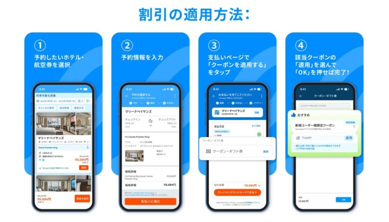 トラベロカの公式アプリから予約すると、さらにお得な割引が受けられるアプリ限定クーポンです。クーポンコード「TVAPP」を入力することで、特別割引が適用されます。