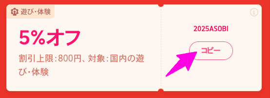 遊び・体験専用の割引クーポンコードやお得情報は下記のボタンから最新情報を確認できます。