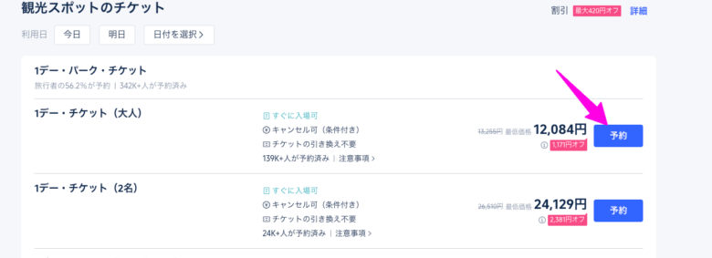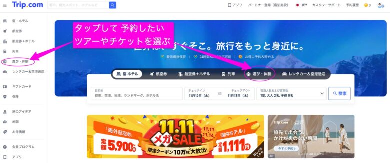希望する航空券、ホテル、eSIM、遊び・体験などを選択し、予約手続きを進めます。(ここでは遊び・体験)