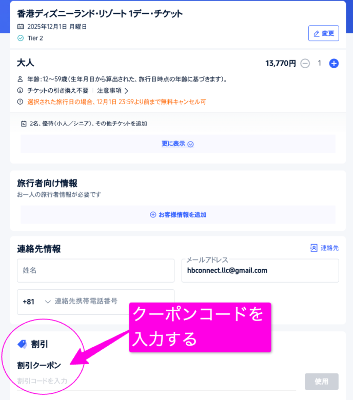 予約手続き中に、支払い画面で「クーポンコードを入力」または「プロモーションコードを適用」の欄に、取得したクーポンコードを入力します。