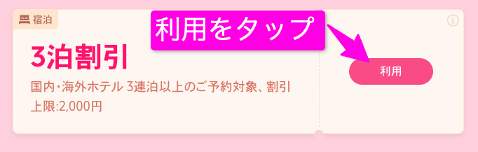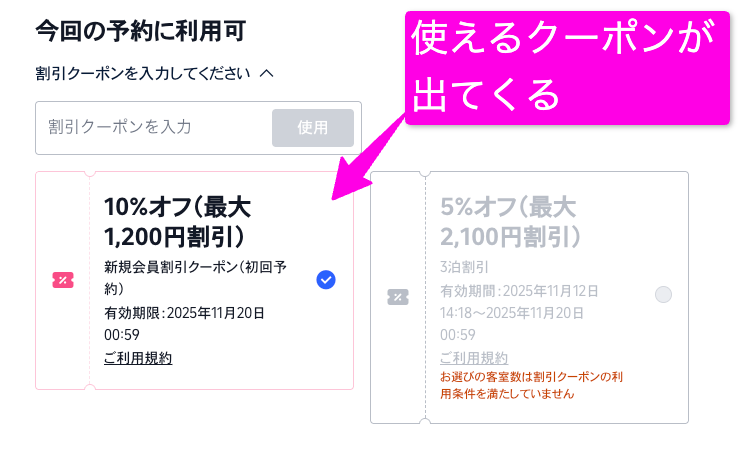 - アプリ限定のクーポン — ウェブからは適用されない場合があるため、アプリから予約・適用する。