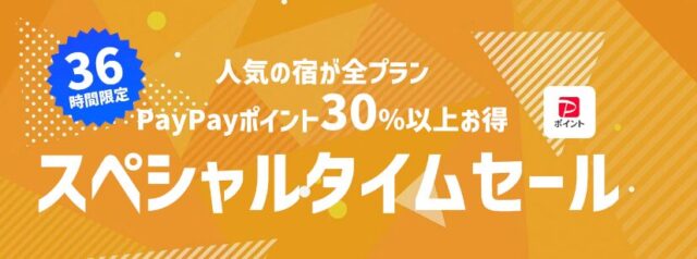 | △ 開始前 | →36時間限定 20%以上お得 タイムセール | ・12月4日(木)正午 ~ 12月5日(金)23:59 開催前 ・12月9日(火)正午 ~ 12月10日(水)23:59 開催前 ・12月14日(日)正午 ~ 12月15日(月)23:59 開催前 ・12月19日(金)正午 ~ 12月20日(土)23:59 開催前 | ・人気宿の全プランが実質20%以上お得 (割引+PayPayポイント還元) ・割引+高還元ポイント ・付与されるのはPayPayポイントで、「すぐに使う」か 「貯める」かを選択可能 ・全国約5,000件以上の宿泊施設がセール対象 ・PayPayポイントは出金・譲渡不可だが、 PayPay・PayPayカード公式ストアなどで利用可能 |