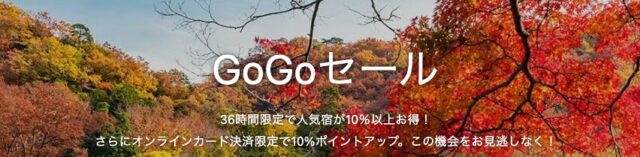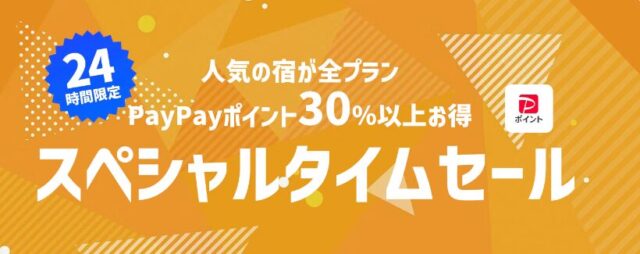| ◎ 開催中 | →GoGoセール (5のつく日・日曜) | 次回: 12/4(木) 正午 | ・毎月「4・9・14・19・24・29日」開催 ・PayPayポイント20%以上 ・人気の宿泊施設が安くなる定番企画 |
