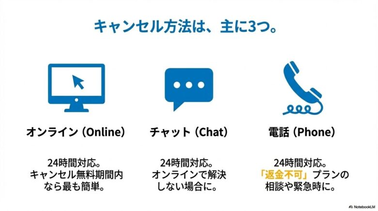 まず「オンラインでキャンセル」を試し、うまくいかない場合は「チャット」または「電話」で問い合わせるのが効率的です。※システムメンテナンスなどで一時的に利用できない場合があります。