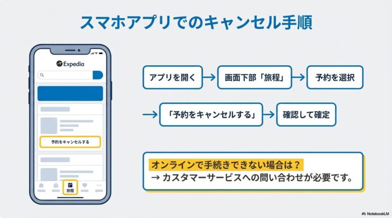 アプリを開く→画面下部の「旅程」タブ→予約を選択→「予約をキャンセルする」→確認して確定、の流れです。アプリからも基本的に24時間いつでも手続きできます。