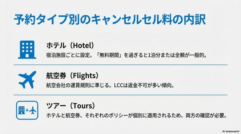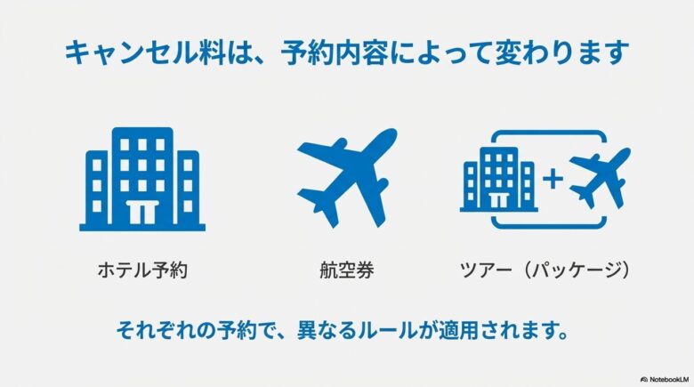 ツアーパッケージは個別に予約するより安いことが多いですが、キャンセル条件が複雑になりがちです。予約前にしっかり確認しておきましょう。