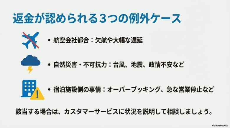 • 返金不可でも諦めない:欠航や自然災害、宿泊施設側の事情など例外ケースもあり