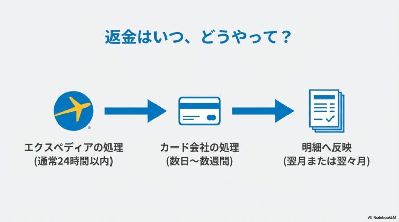 エクスペディア側の処理は比較的早いですが、実際にお金が戻ってくるタイミングはカード会社や銀行の締め日・処理速度によって大きく変わります。