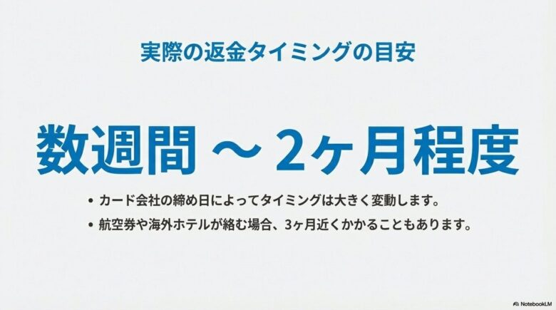 一般的には、キャンセルから数週間〜2ヶ月程度で返金が確認できることが多いです。ただし、航空券や海外ホテルなどが絡む場合は、カード会社や決済経路の都合で3ヶ月近くかかることもあるため、少し長い目で次月以降の明細を確認してみてください。