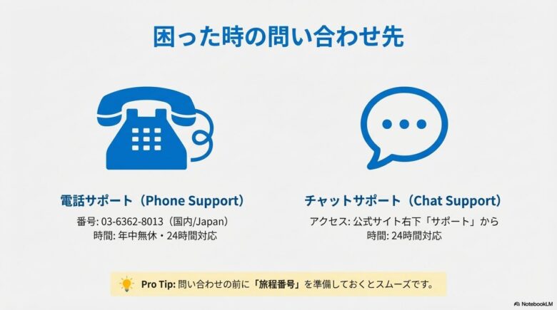 これらのケースでは、まずカスタマーサービスに相談することをおすすめします。状況によっては返金だけでなく、日程変更やクーポンなど柔軟に対応してもらえる場合があります。