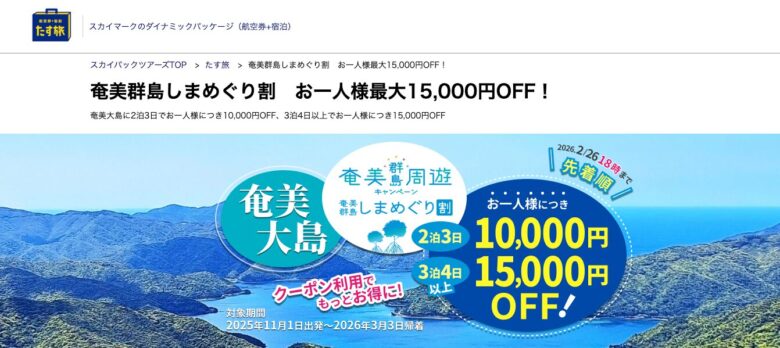 【最大1.5万円引】スカイパックツアーズ「奄美群島しまめぐり割」の評判は?お得な周遊プランを徹底解説!
