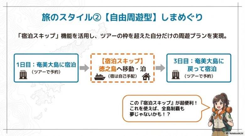 ② 自由周遊型しまめぐり:「宿泊スキップ」で全島制覇も夢じゃない!?