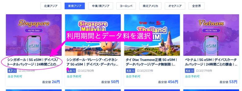 Trip.comのeSIMの料金は、渡航先の国・地域、利用期間、データ容量によって異なります。